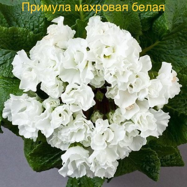Травянистое многолетнее растение, одно из самых раннецветущих, относится к семейству Первоцветные. Образует компактный и очень выровненный кустик высотой 15 см. Листья прикорневые, цельные. Цветки крупные, полностью махровые, белого оттенка, похожие на небольшие розочки. Хорошо растет и обильно цветет в полутенистых местах, на удобренной, достаточно увлажненной почве. Легко переносит пересадку даже во время цветения. Семена высевают в открытый грунт осенью или весной после стратификации во влажном песке при низкой положительной температуре, в течение 3-4 недель. При температуре почвы 10 °С всходы появляются через 25 дней. На постоянное место высаживают весной или осенью второго года. Высаживать примулы надо с таким расчетом, чтобы посадки были сомкнутыми, а между розетками листьев не было открытого пространства. Молодые растения зацветают на второй год. Цветение продолжительное с апреля по июль. Используют для посадки в бордюры, рабатки и каменные горки, особенно в тени, а также для зимней выгонки. Растение, пересаженное осенью в горшок, зацветает в комнатных условиях в марте-апреле.