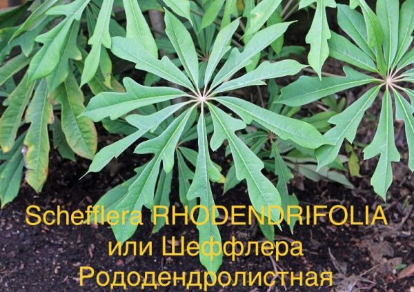 Schefflera RHODENDRIFOLIA или Шеффлера Рододендролистная - дерево до 20 м высотой, однодомные. Черешок до 30 см длиной. Листья пальчато-сложные. Черешки листочков 1-2,5 см длиной. Листочки в числе 6 или, узковато-яйцевидные, продолговато-ланцетные или почти эллиптические, 12-20 см длиной и 3-5 см шириной, кожистые, опушенные в молодом возрасте, позднее – голубоватые и серовато-желтые, основание клиновидное, край цельный, волнистый, иногда с зазубренными или перистыми долями на молодых растениях, вершина заострена. Соцветие – конечная метелка с зонтиками, густо опушенная. Цветки мелкие, незаметные. Плод шаровидный, 4-5 мм в диаметре.