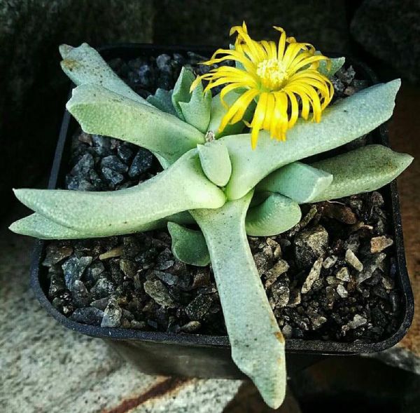 Многолетний суккулент, с сочными, цилиндрическими, голубовато-зелеными листьями, образует густые плотные кочки или коврики около 7,5-10 см высотой. Стебель очень короткий, междоузлия с листовыми остатки. Листья супротивные по 2-4 неравные пары, голубовато-серые, становится красноватыми, в форме лодки, около 3-5 см длиной и около 1-1,2 см шириной у основания, полукруглые в сечении, сужаются к вершине, почти ложковидной формы с маленькими коричневыми зубцами до 0,4 см длиной, на кончиках листьев.Цветки 3,5-4 см в диаметре, с 30-42 бледно-желтыми лепестками и 130-200 тычинками.
