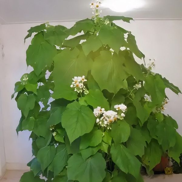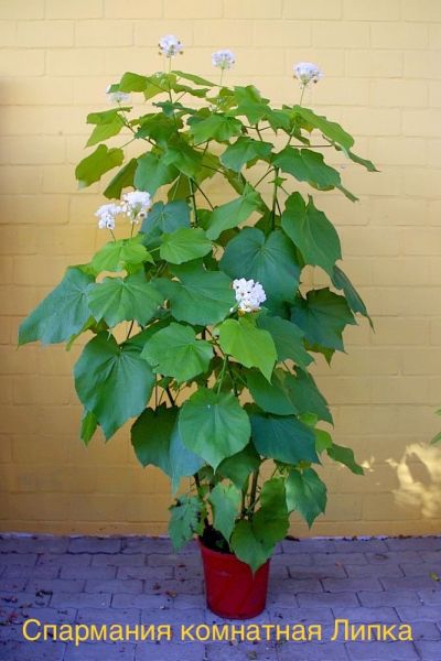 Быстрорастущее комнатное растение, относится к семейству Липовые. Листья зеленые, сердцевидные, крупные, до 20 см, сверху и снизу опушены. Цветки белые, довольно крупные, на длинных цветоносах, собраны в густые зонтики. Их украшают красные пыльники многочисленных желтых тычинок. Цветение наступает в основном зимой с трехлетнего возраста и продолжается довольно долго, отцветшие цветоносы обрезают. Спармания требовательна к светлым местам, притеняемым летом от полуденных жарких лучей. Зимой предпочтительней проветриваемое, прохладное место с температурой 10 °C и умеренные поливы. С весны до осени растение поливают обильно, но без застоя воды и подкармливают еженедельно. Спармания хорошо размножается семенами, посев производят ранней весной. Всходы быстро развиваются. Пересаживают молодые растения ежегодно, обеспечивая хороший дренаж. После трехлетнего возраста – через 2 года. Почвенный состав: 2 части глинисто-дерновой земли, 1 часть листового перегноя и 1 часть песка. При использовании более питательной почвы растение интенсивно растет в ущерб цветению. Для получения пышных и красивых экземпляров весной и летом спарманию обрезают, сдерживая ее рост и заставляя куститься. Широко используют для озеленения интерьеров.