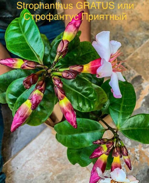 Strophanthus GRATUS или Строфант Приятный, Олеандр Вьющийся - самый декоративный вьющийся вид, у которого цветы будто бы вырезаны из ценной древесины тропического дерева. Принадлежит семейству Кутровые. Строфантус свое название берет от греческих слов «strophos anthos», что может быть переведено как «витая веревочка». Это название обусловлено его внешним видом. Все дело в том, что для цветков этих растений характерны очень длинные, закрученные нитевидные сегменты венчика, которые весьма декоративно свисают с цветков. Эти цветки отдаленно напоминают выпущенные ядовитые стрелы, поэтому название этого растения («poison arrow») в переводе с английского означает «ядовитая стрела».