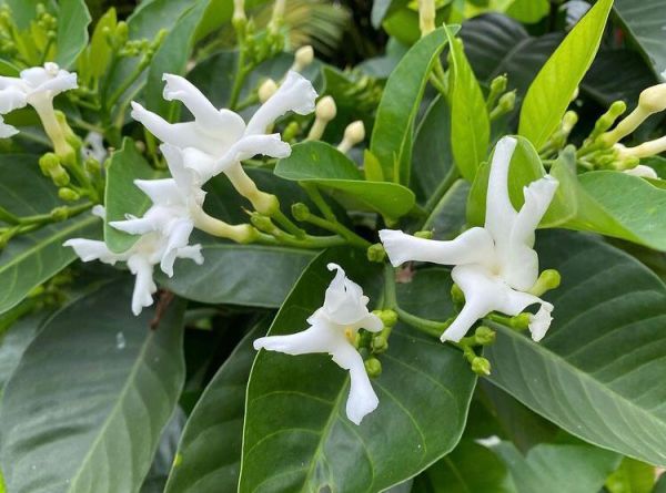 В этом цветке совершенным кажется все - и аккуратный, правильной формы пышный куст средней высоты, и цветки, и листья - насыщенно-зеленые, кожистые, глянцевые, длиной 7-12 см, шириной 3-4 см, продолговатые, с заостренным и слегка отогнутым вниз кончиком, сидят супротивно на крепких одревесневающих побегах со светлой корой. Листья плотные, на коротких толстых черешках, поэтому они никогда не бывают поникшими или увядшими. Растение напоминает лимонное деревце в миниатюре или вышеупомянутую гардению, хотя даже не состоит ни с одним из них в родстве.