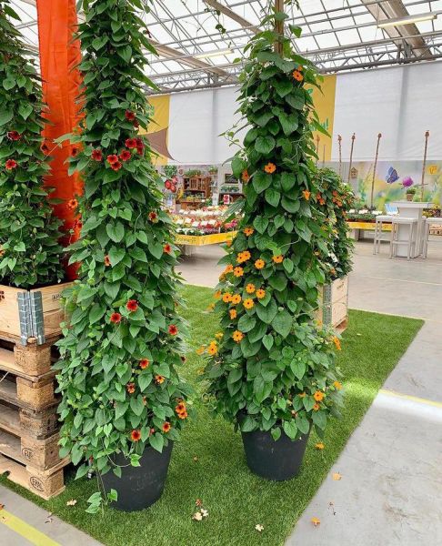 Вьющееся горшечное растение, отличающееся быстрым ростом, обильным и длительным цветением. Пригодно для выращивания как в помещении, так и на открытом воздухе. Великолепно для арок и пергол, эффектно смотрится в подвесных корзинах, быстро обовьет опору любой формы. Привлекательные цветки диаметром до 3,5-4 см с выразительным черным «глазком» эффектно смотрятся на фоне темно-зеленых сердцевидных листьев. Многолетник, в открытом грунте культивируется как однолетник.