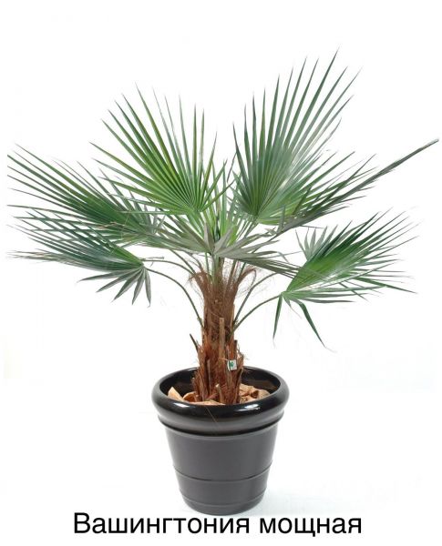 Красивая многолетняя пальма, достигающая в природе 20 м. Растение неприхотливое, очень интересное для комнатного цветоводства. Вашингтония мощная отличается от вашингтонии нитеносной вытянутым стволом и густой, компактной кроной. Эффектные серо-зеленые веерные листья (до 2 м) на развитых черешках состоят из многочисленных листовых сегментов, между которыми свисают тонкие кудрявые нити. В природных условиях засохшие листья отгибаются книзу и висят на дереве, образуя вокруг ствола широкую "юбку". В домашних условиях увядающие листья удаляют вместе с большей частью черешка, остатки черешков одревесневают и образуют мощный ствол. Цветет весной длинными кистями с ароматными желтыми или белыми цветами. В конце лета созревают красно-черные плоды с овальными семенами. Размножается семенами. Семена замачивают на двое суток в теплой воде, затем высаживают в рыхлый субстрат из дерновой, листовой земли и песка (2:2:1). При комнатной температуре всходы появляются через месяц. Вашингтония предпочитает солнечные места и обильный полив теплой водой в период интенсивного роста. С наступлением осени полив постепенно сокращают, растение размещают в светлом прохладном месте. Ежегодно пальму переваливают, постепенно увеличивая размер горшка. Вашингтония мощная чуть менее холодостойка, чем вашингтония нитеносная, и предпочитает более влажный климат. В южных регионах ее можно выращивать в открытом грунте, укрывая на зиму ствол (листья удаляют).